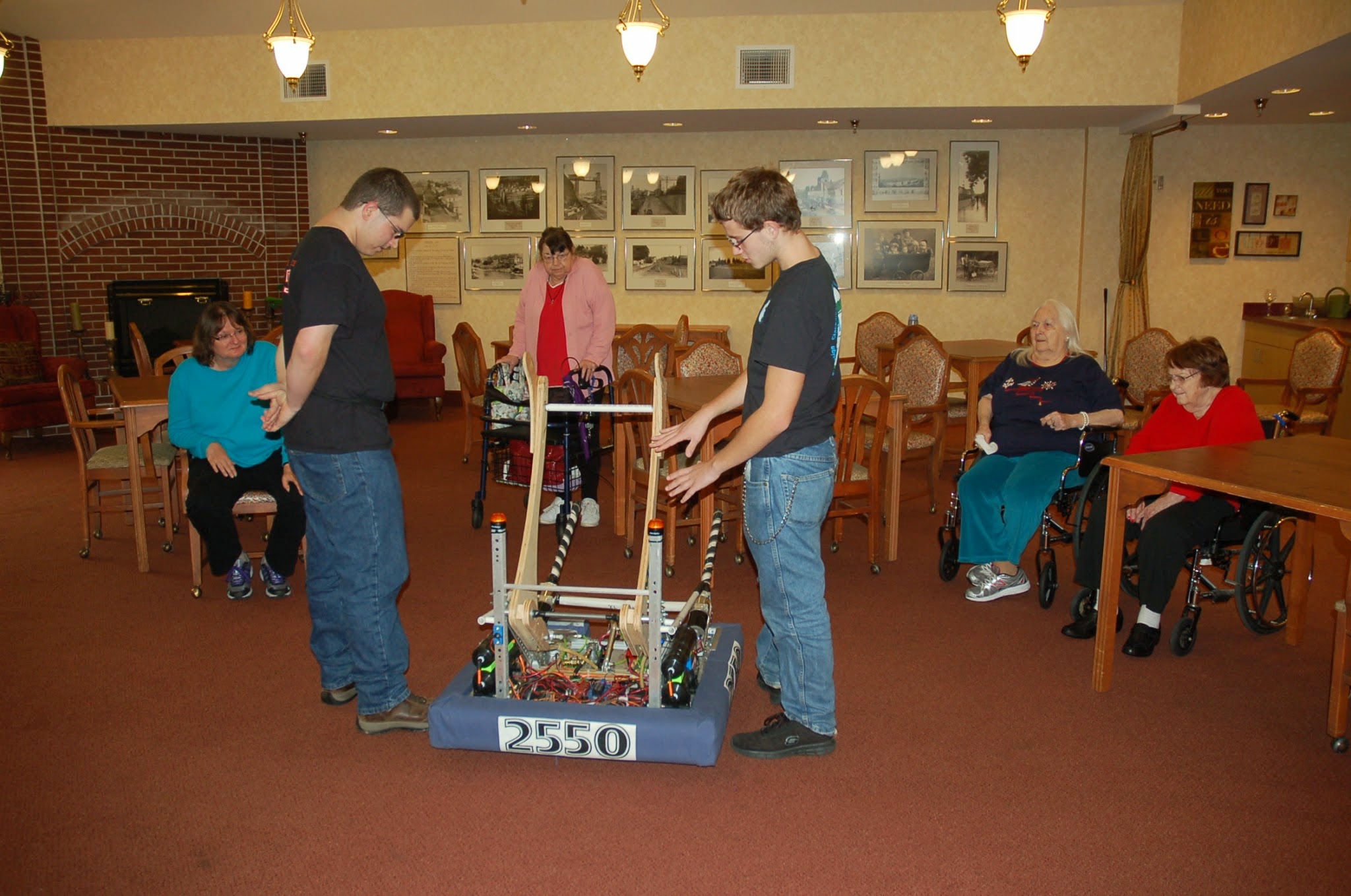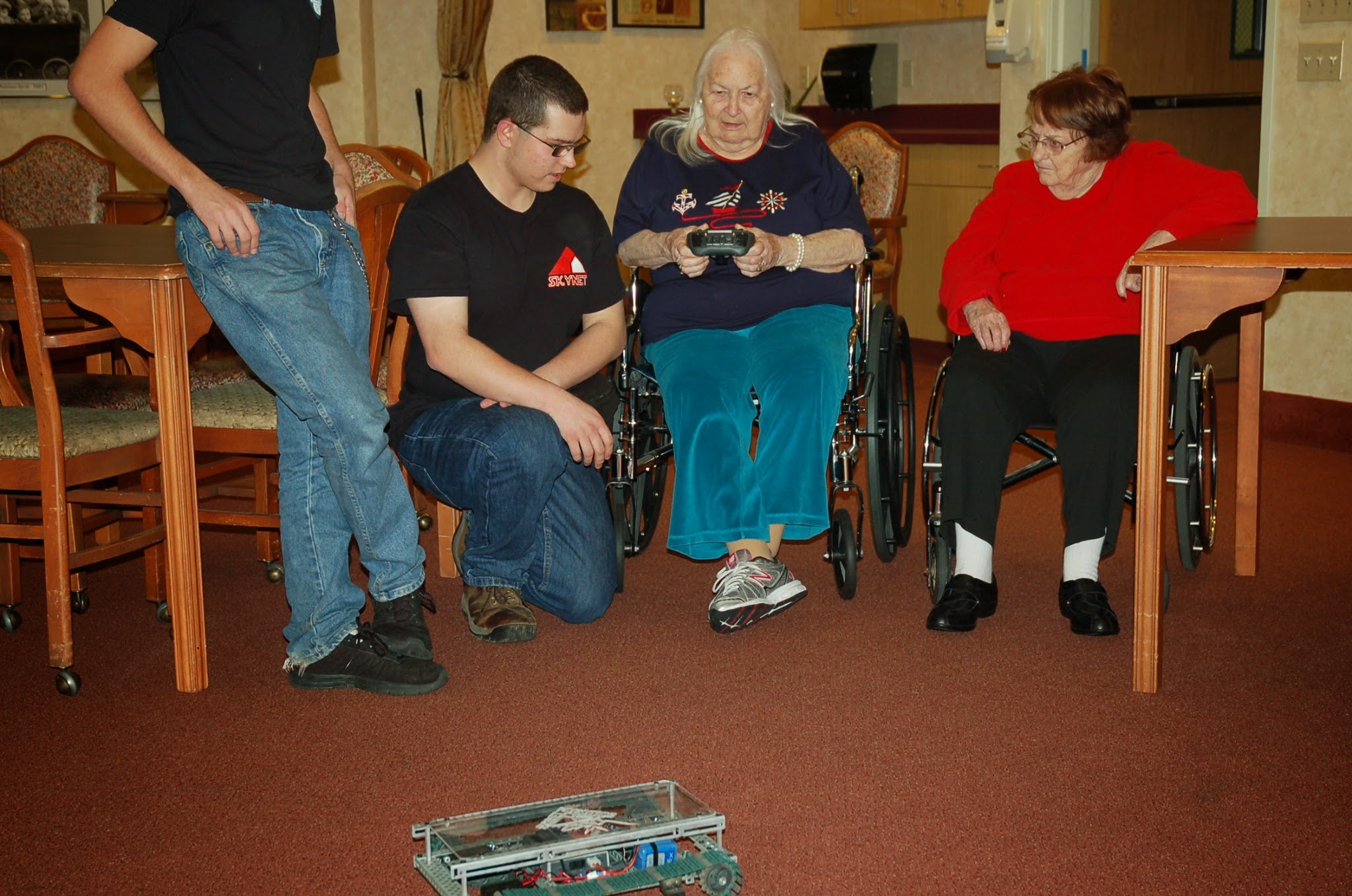| Caleb and Biggs explain the robot to the elderly |