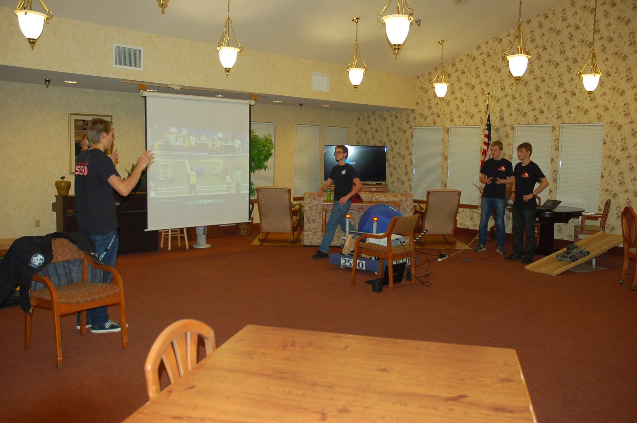 Today we went to the Gilman Park Assisted Living Center and presented our team. We were able to explain what FIRST is, and what an FRC team is and does. Our team was also able shoot a couple of balls, and play some videos of last year matches. You can view all the photos from that event here. Below are a few highlights.