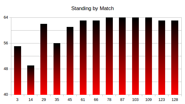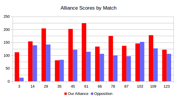 This graph shows final score of every match in which we competed. Our alliance is always represented as red. We won every match in which the red bar is higher than the blue.We’ve tested the robot without autonomous, second to last day of the build season…